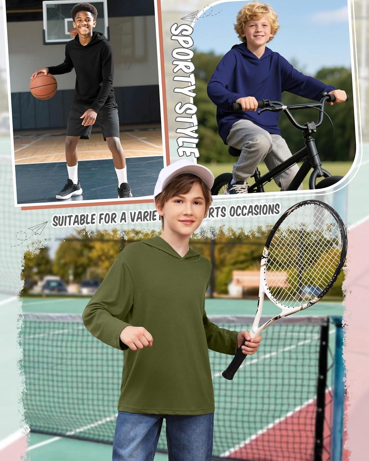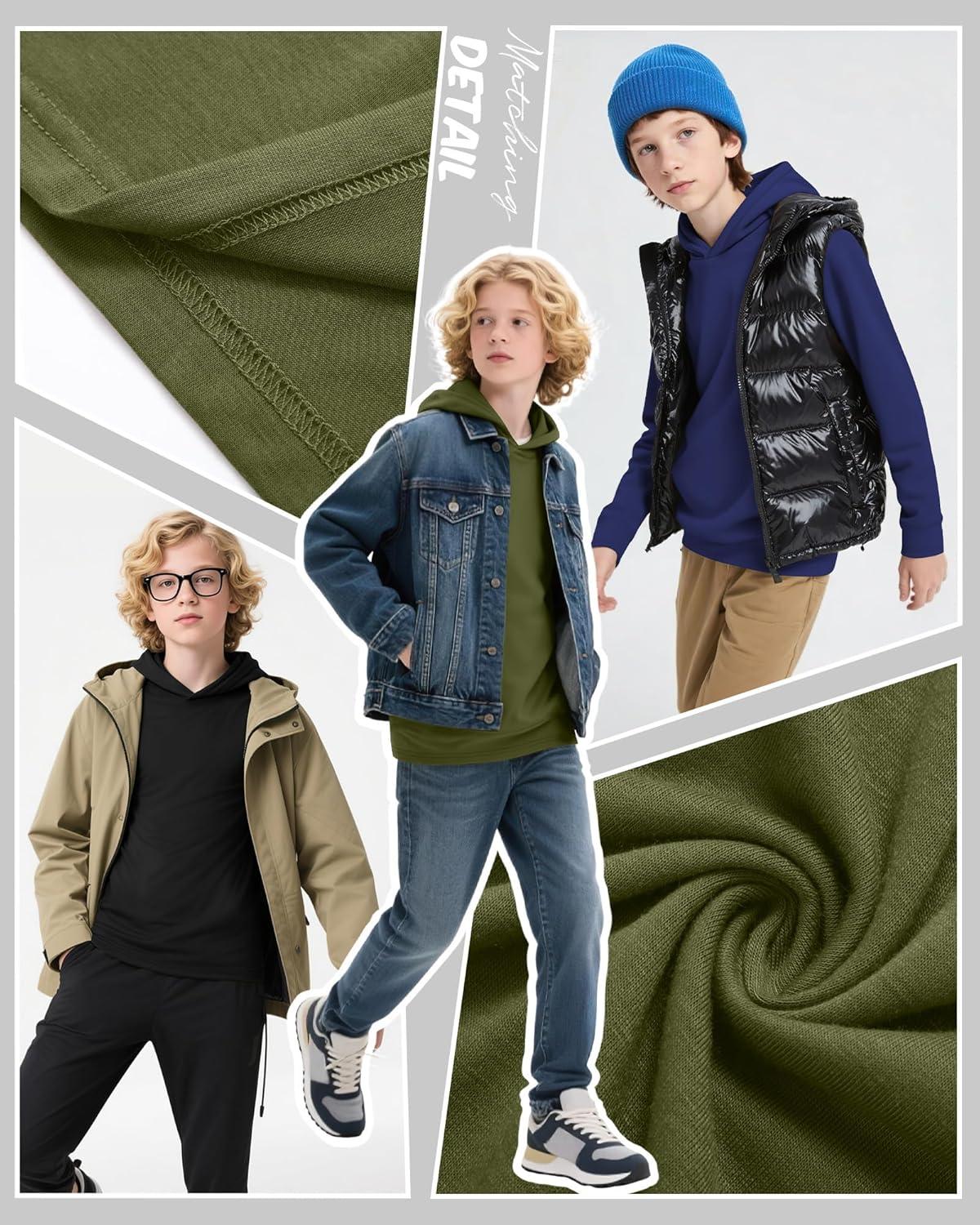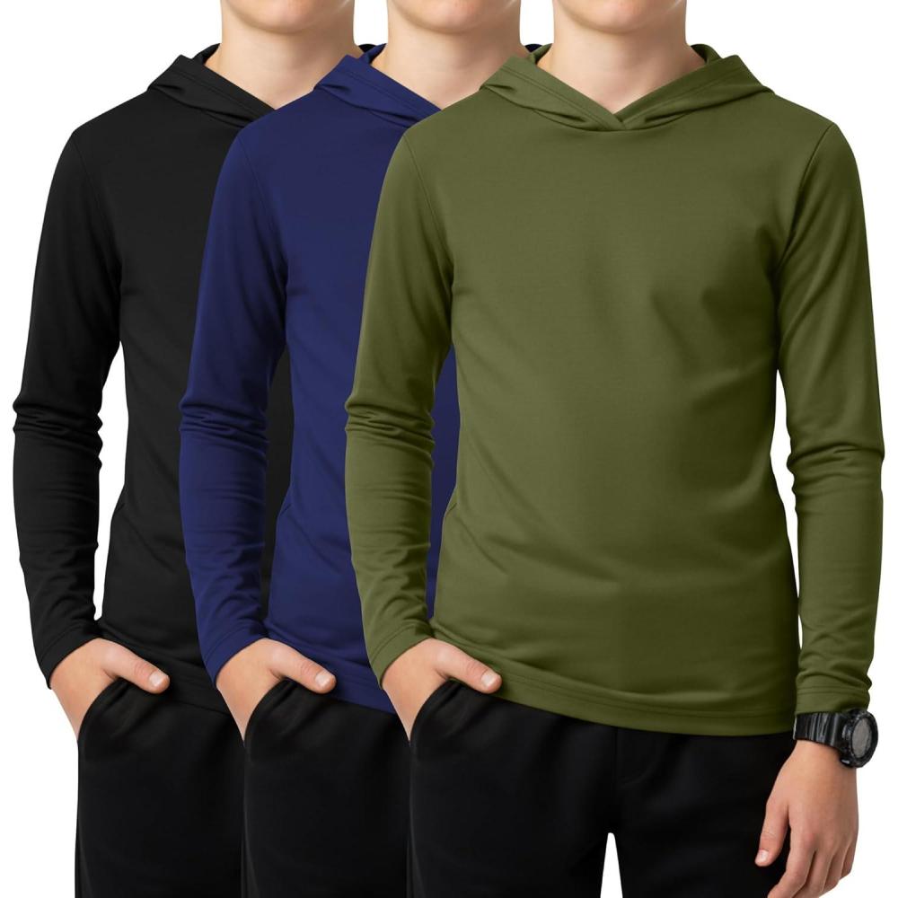 3 Pack Boys Long Sleeve Hoodies Kids Comfy Active Athletic Workout Sweatshirts Casual Pullover Shirts (Ages 6-18)(Army Green Navy Blue Black)