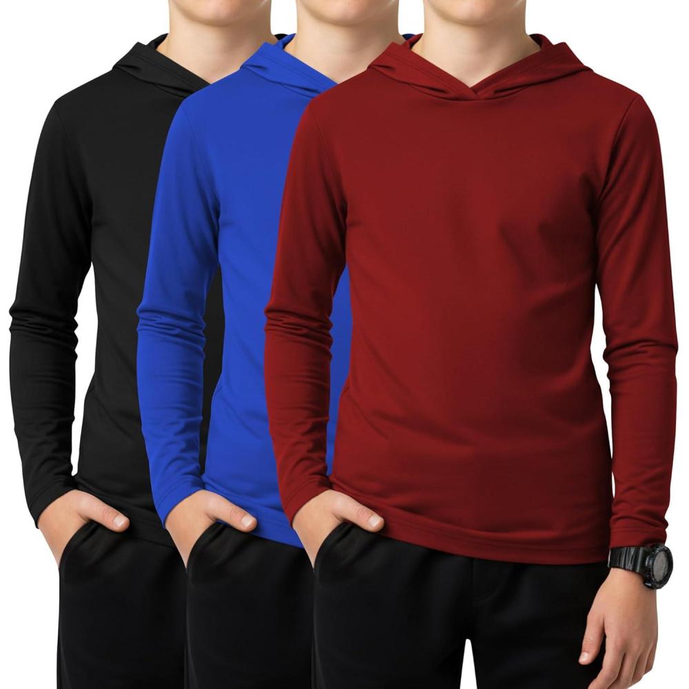 3 Pack Boys Long Sleeve Hoodies Kids Comfy Active Athletic Workout Sweatshirts Casual Pullover Shirts (Ages 6-18)(Wine Red Blue Black)