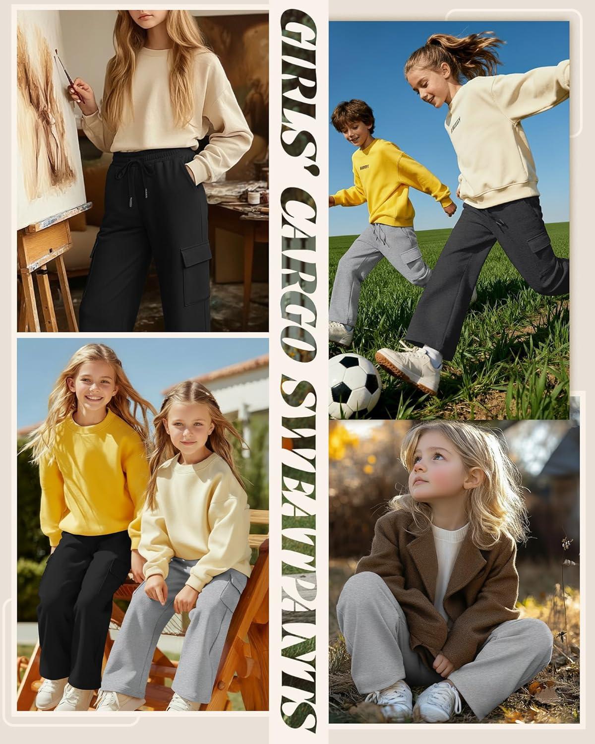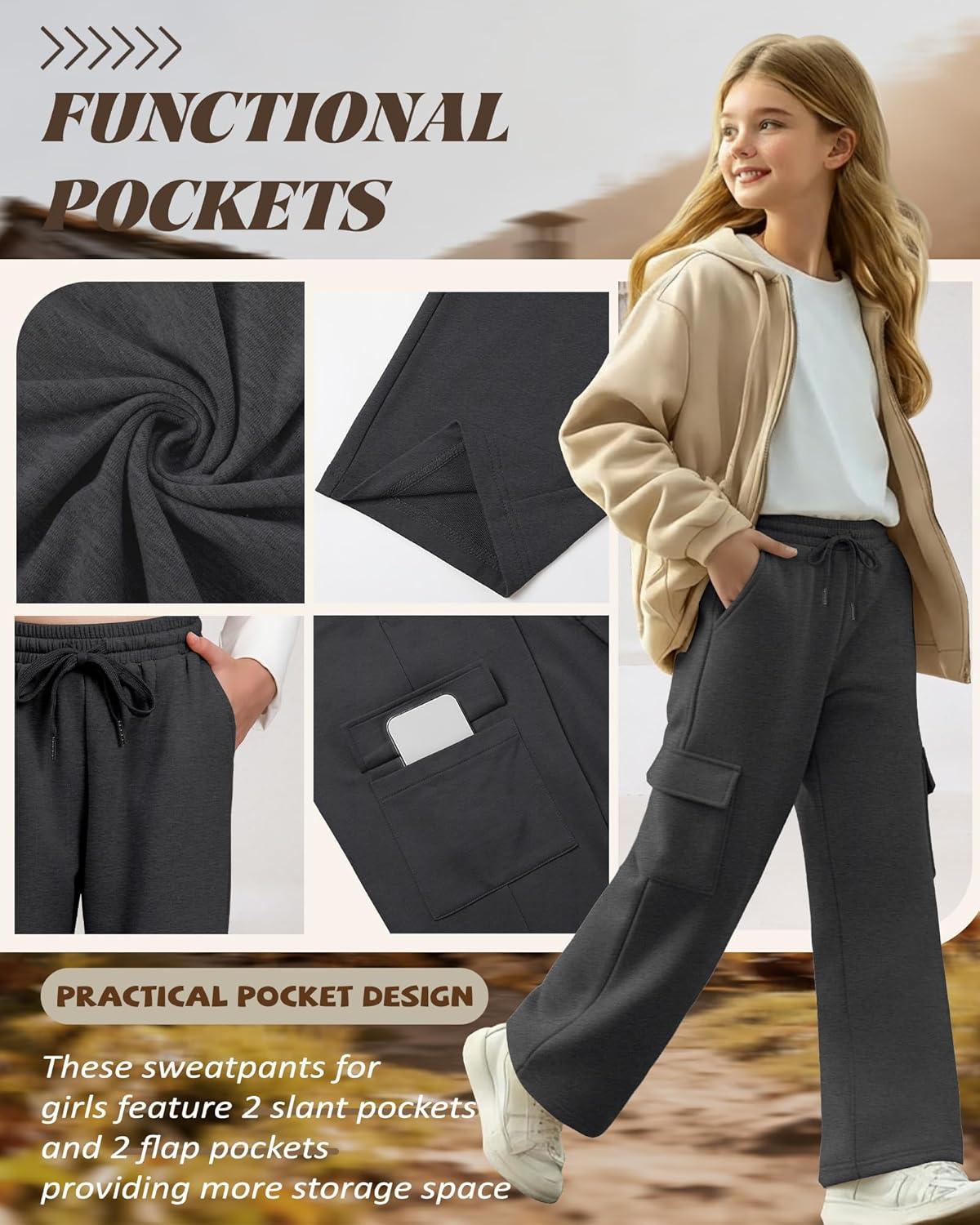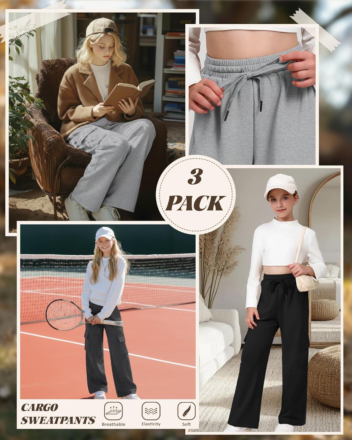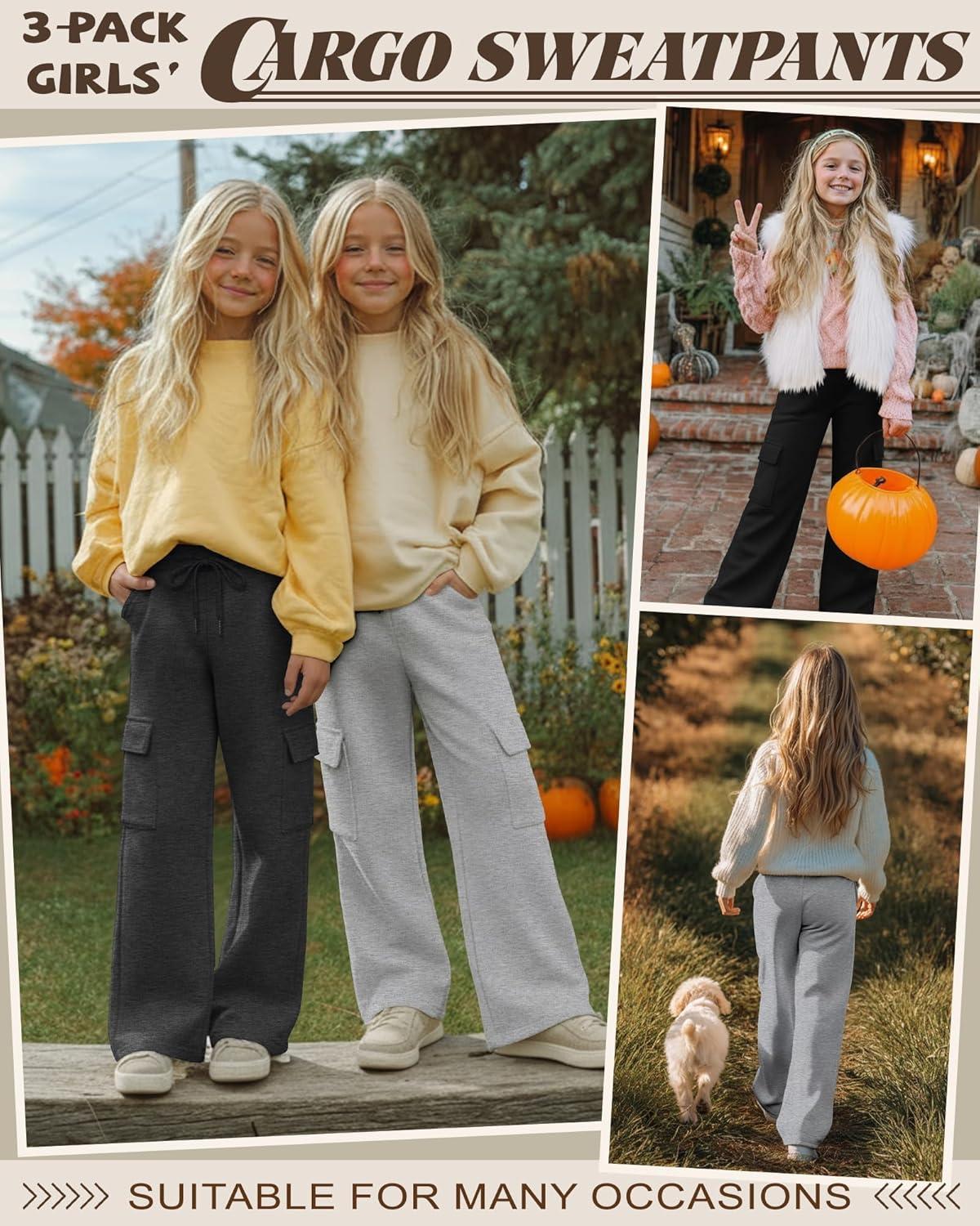 3 Pack Girls Cargo Sweatpants Kids Wide Leg High Waist Drawstring Pants Casual Baggy Athletic Trousers (Ages 5-14)(Dark Gray Light Gray Black)