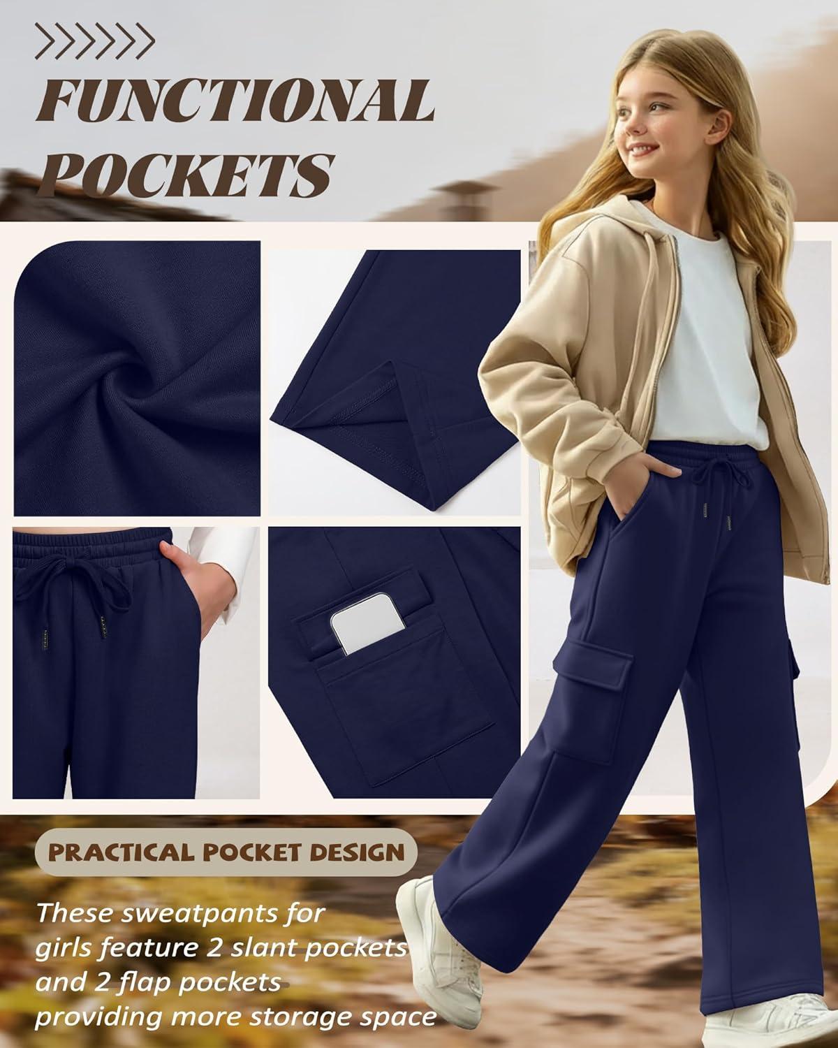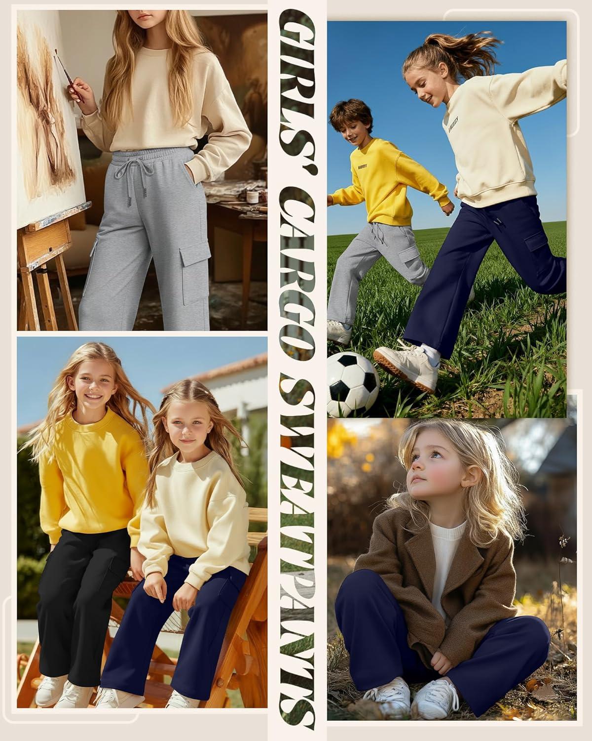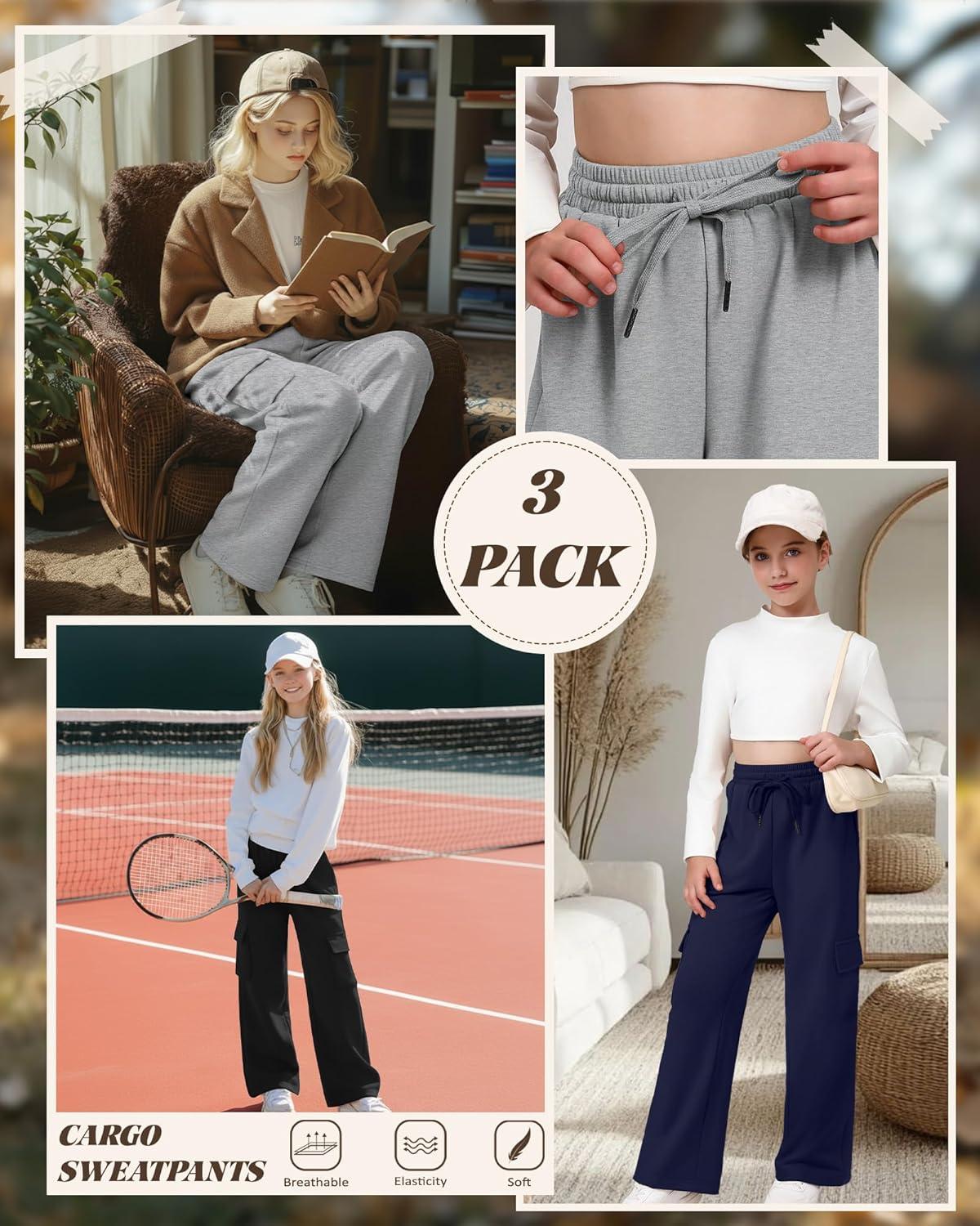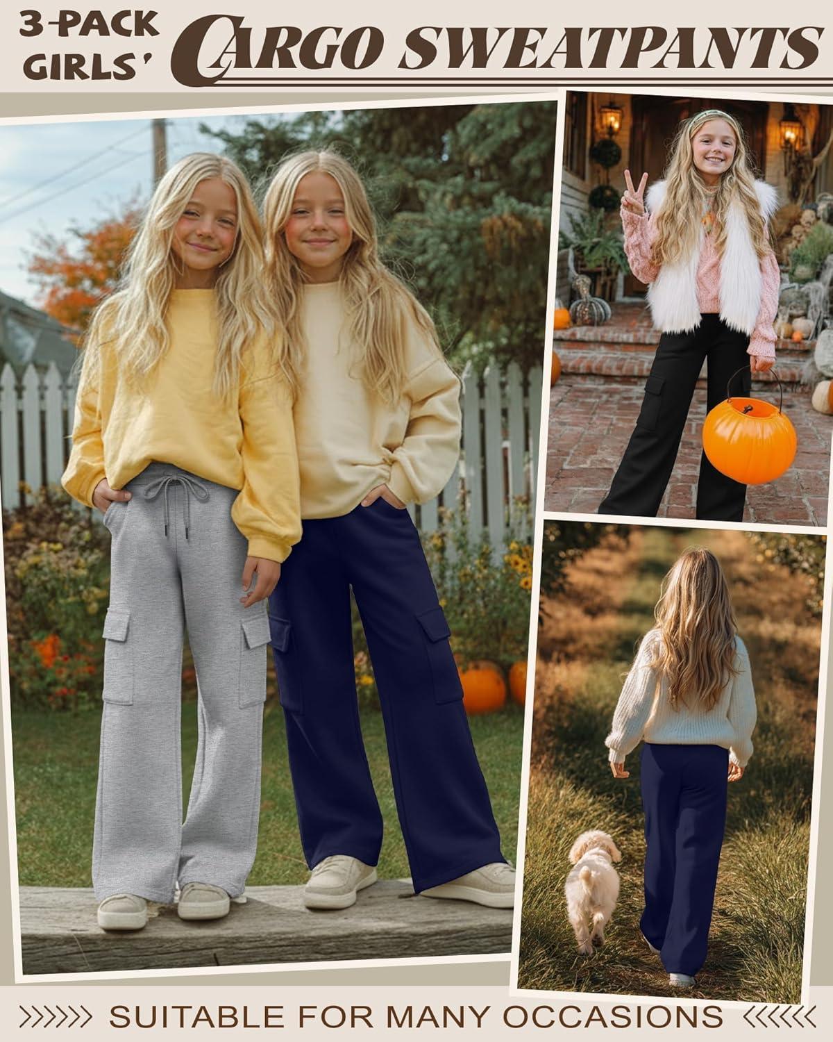 3 Pack Girls Cargo Sweatpants Kids Wide Leg High Waist Drawstring Pants Casual Baggy Athletic Trousers (Ages 5-14)(Navy Blue Light Gray Black)