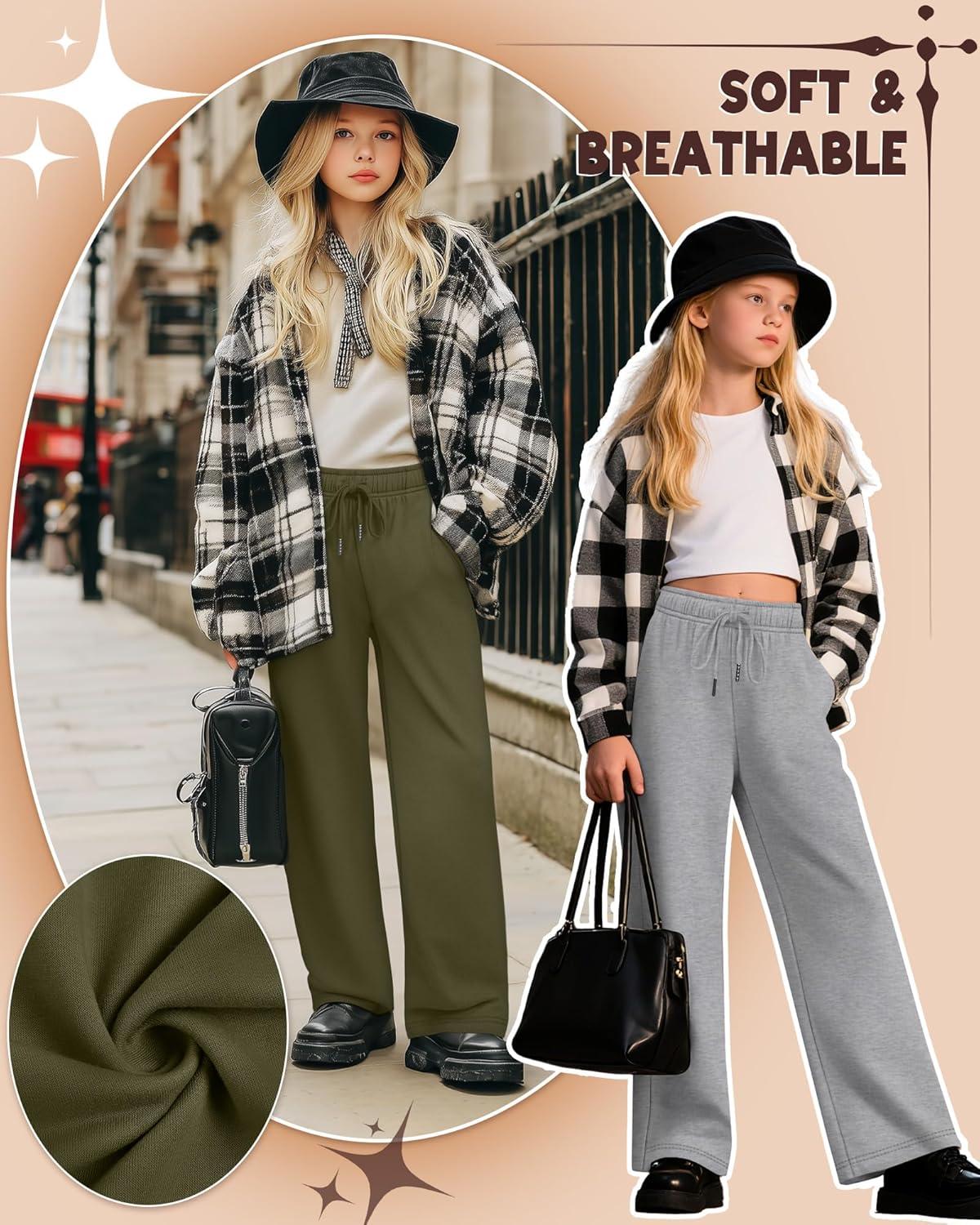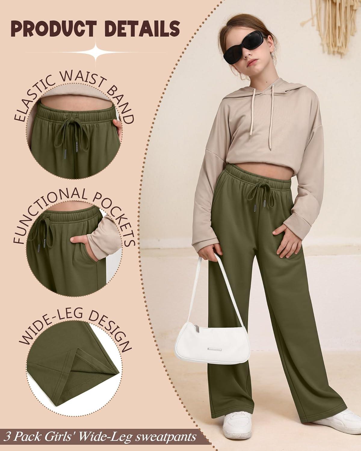 3 Pack Girls’ Sweatpants Wide Leg Drawstring Casual Kids Joggers Open Bottom Loose Solid Teen Pants with Pockets(Army Green Light Gray Black)