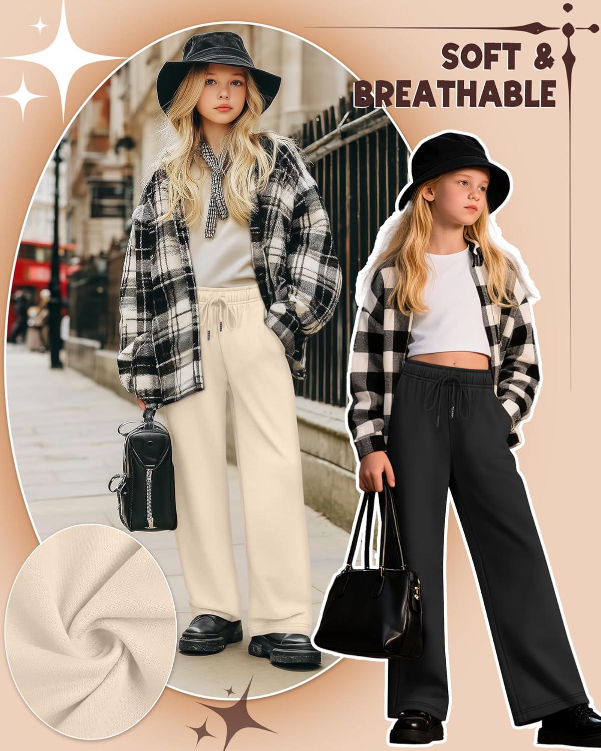 3 Pack Girls’ Sweatpants Wide Leg Drawstring Casual Kids Joggers Open Bottom Loose Solid Teen Pants with Pockets(Beige Gray Black)