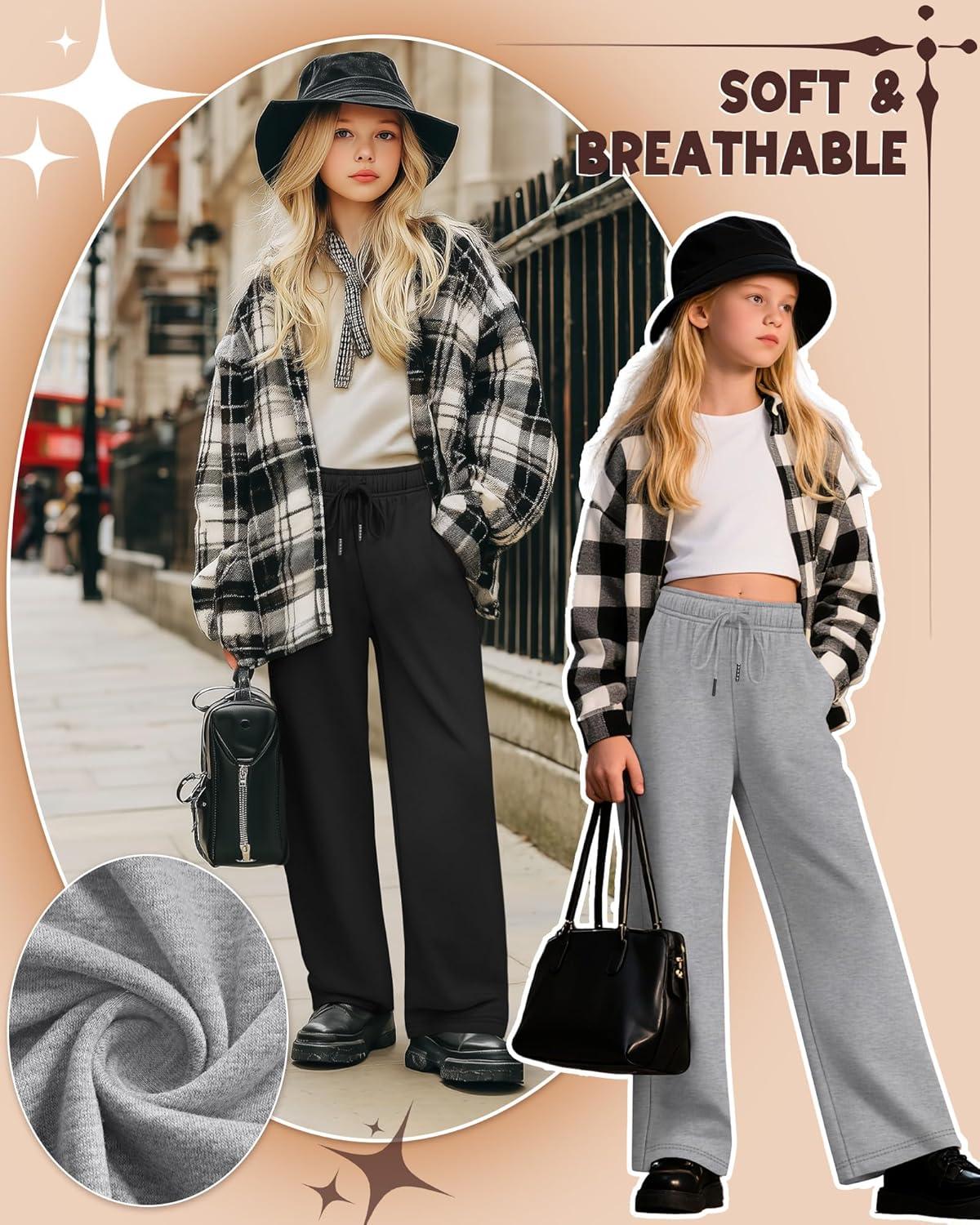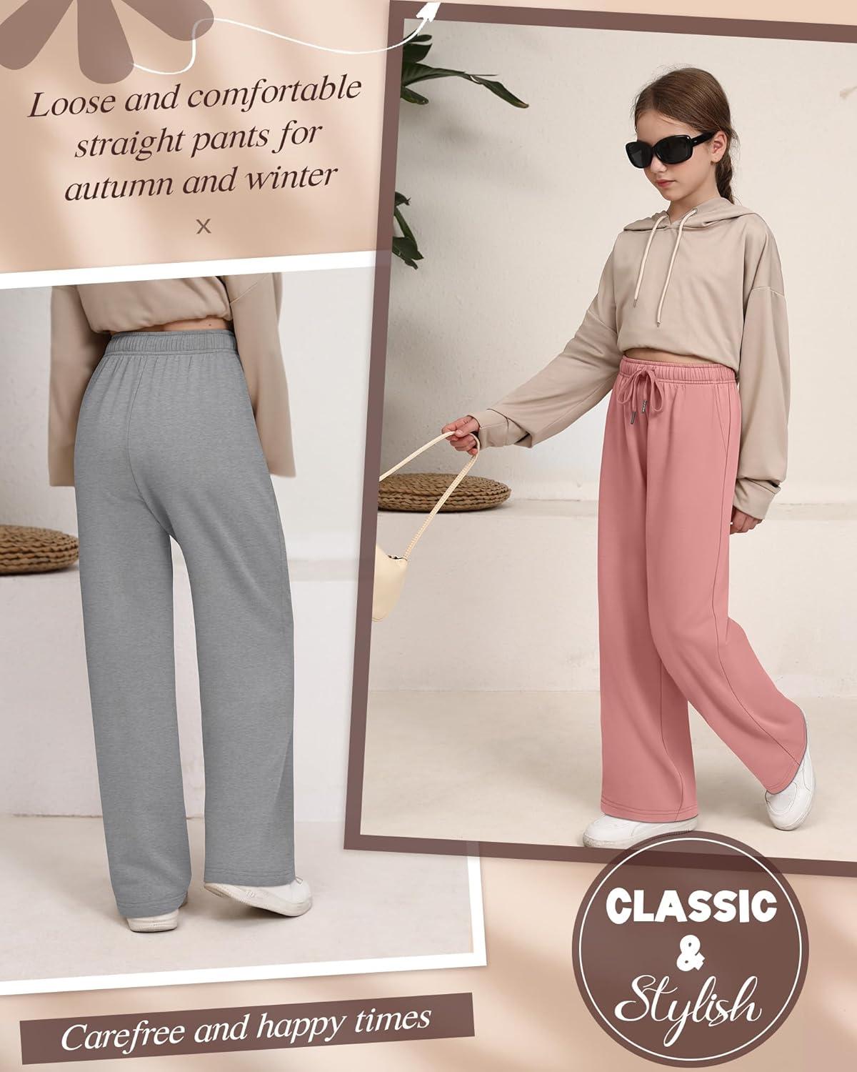 3 Pack Girls’ Sweatpants Wide Leg Drawstring Casual Kids Joggers Open Bottom Loose Solid Teen Pants with Pockets(Coral Pink Light Gray Black)
