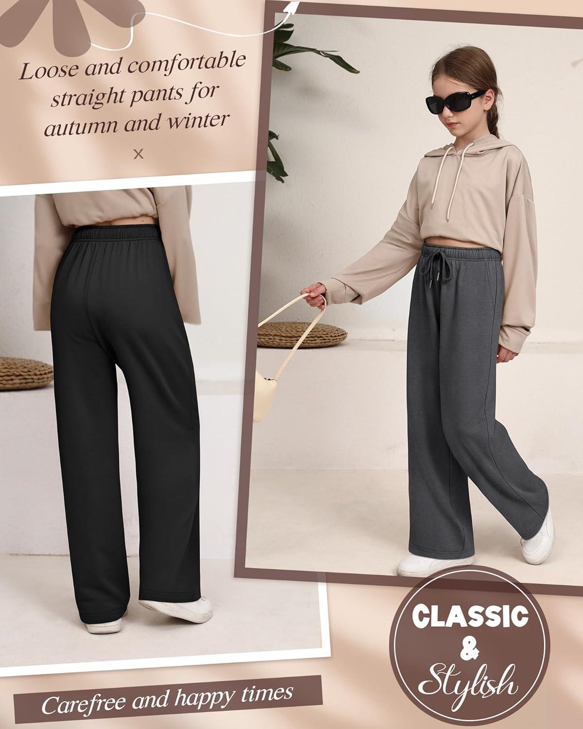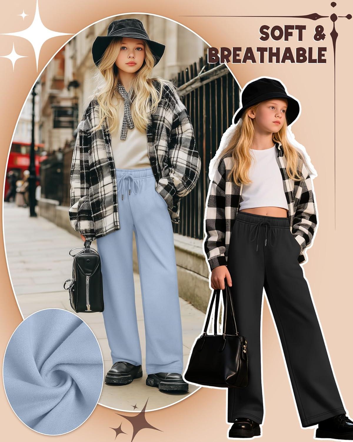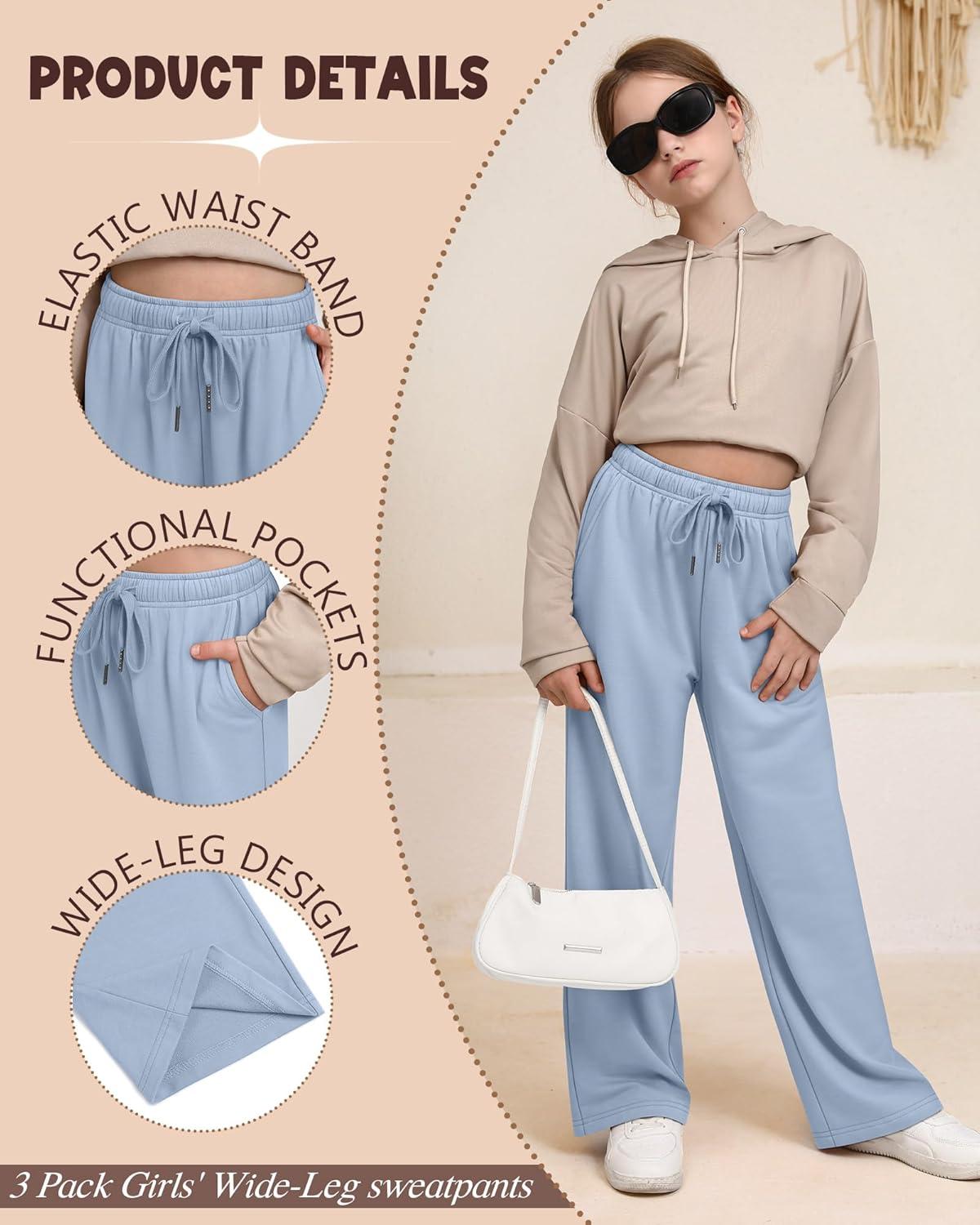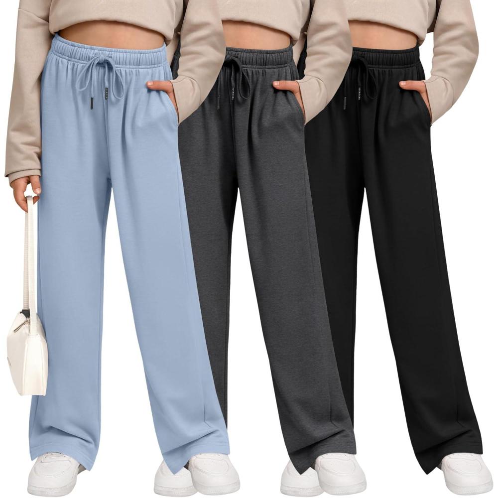 3 Pack Girls’ Sweatpants Wide Leg Drawstring Casual Kids Joggers Open Bottom Loose Solid Teen Pants with Pockets(Light Blue Dark Gray Black)