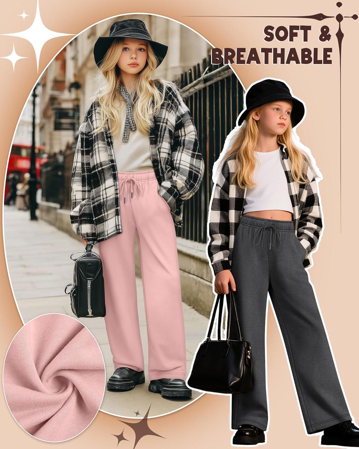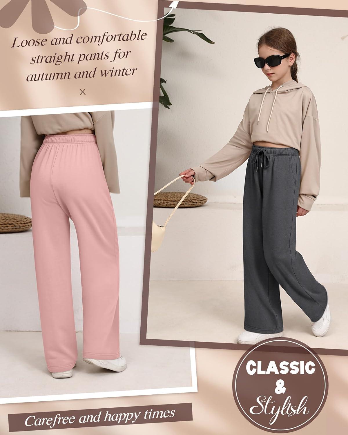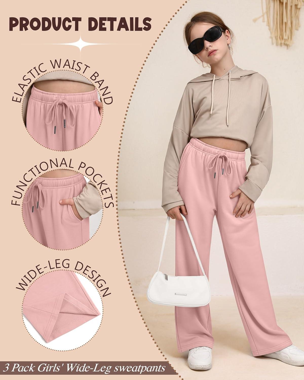 3 Pack Girls’ Sweatpants Wide Leg Drawstring Casual Kids Joggers Open Bottom Loose Solid Teen Pants with Pockets(Light Pink Dark Gray Black)