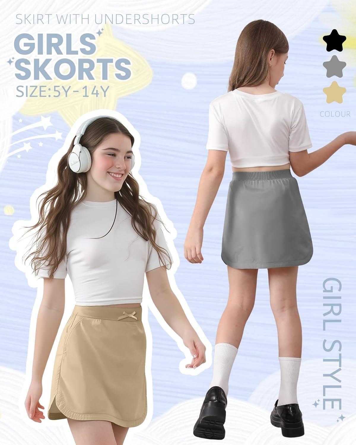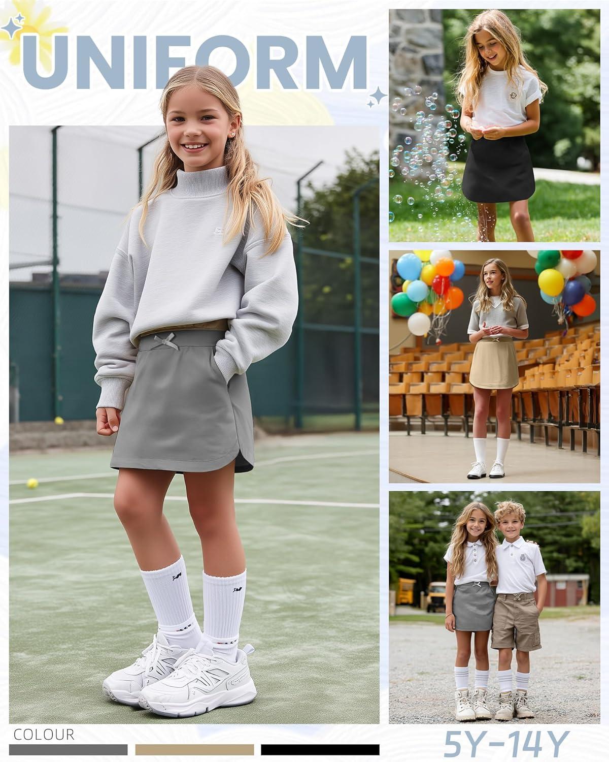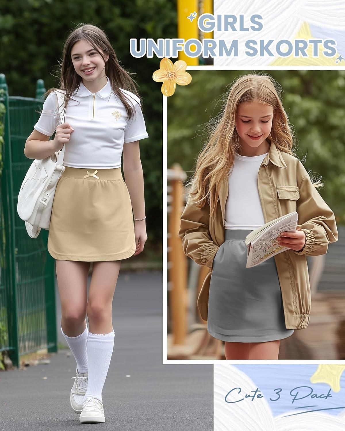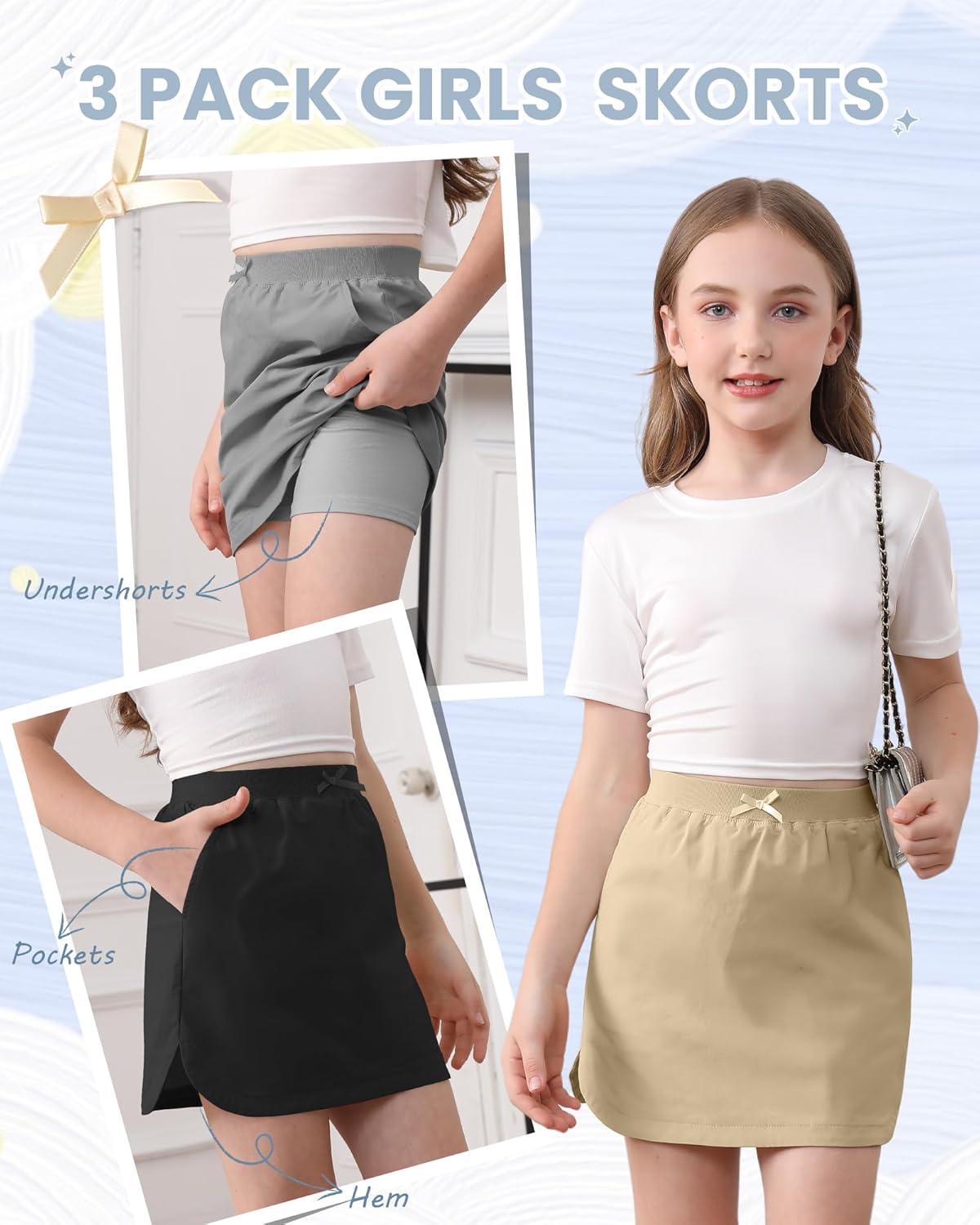 3 Pack Girls Uniform Skorts School Pull-on Scooter Skirt with Undershorts for Teens Back to School(Khaki Dark Gray Black)